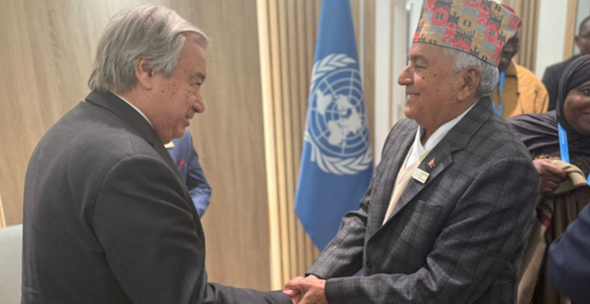 राष्ट्रसङ्घका महासचिव एन्टोनिओ गुटेरेसले अल्पविकसित राष्ट्रहरूका राष्ट्रर सरकार प्रमुखहरूसँग बुधवार सामूहिक भेटघाट गरेका थिए । सोही कार्यक्रममा राष्ट्रपति पौडेलले जलवायु परिवर्तनले उत्पन्न समस्या अहिले नेपालजस्ता मुलुकले भोगिरहे पनि पछि विकसित देशमा पनि आउनेमा सचेत हुनु पर्ने सुझाव दिए ।